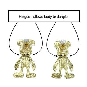 Description: Mickey Mouse earrings | Red, black, yellow, and clear jewel-faceted crystals; White enamel | 18k gold-plated | Hinged at the neck so the body dangles adding a bit of light catching movement |Approximately 1.25” long and 0.75” wide at Mickey’s feet | For pierced ears