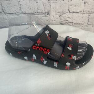 Disney Park Exclusive Crocs Minnie Mouse size Mens 5/Womens 7 good used condition! Comes with one red & black CROCS Jibbitz charm. Minor denting on strap from jibbitz (see photos). Really not noticeable when wearing.