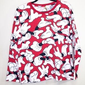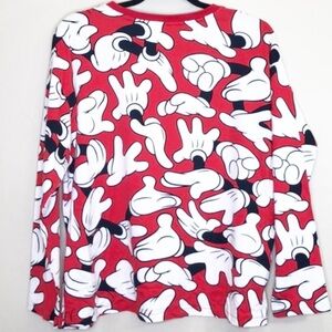 tags only: h&m, disney, collab, mickey mouse, long sleeve tee, hand gloves, allover, red, cotton, crew neck, pullover