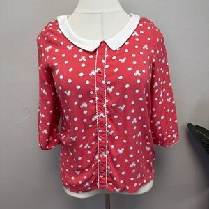 This top is red with white polka dots & Minnie Mouse details, has 3/4 length sleeves, has a collared neckline, has a faux button front design, has a keyhole & button back closure, & is made with 100% rayon. Size L.
