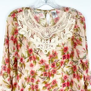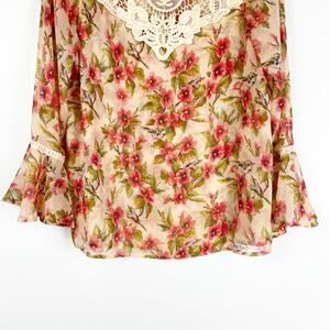 Disney x Lauren Conrad women’s blouse in floral print. Snow White themed print with flowers and blue birds throughout. Crochet lace bodice. Bell sleeves. Sheer with extra panel in front for coverage. Size medium. Excellent used condition. No flaws detected. See measurements for proper fit.