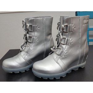 Introducing the Disney x Sorel Big Girls Joan of Arctic Frozen 2 Wedge Boots in size 3. These stylish boots are perfect for any occasion, from casual outings with friends to formal events like christenings. The silver color and wedge heel style make these boots a must-have for any fashion-forward girl, while the leather upper material ensures durability and comfort.