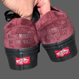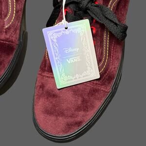 Step into Disney magic with the Disney x Vans Old Skool Stackform 'Poison Apple'. This mahogany suede sneaker channels the Evil Queen from Snow White with embroidered Magic Mirror quotes on the heels and a poison apple charm on the laces. The 34mm platform Sidestripe shoe features elevated velvet uppers, supportive padded collars, and Vans’ signature rubber waffle outsole for comfort and style. Perfect for collectors and Disney fans looking to add a standout piece to their wardrobe.