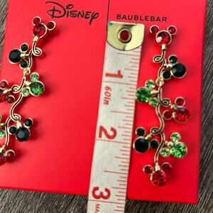 This listing is for a NWT's Disney x Bauble Bar Mickey Mouse Christmas Lights Earrings. The earrings feature red, dark green, and light green Mickey Mouse Christmas String Lights. The earrings hang 3 inches down.