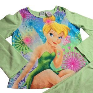 Disney Fairies Pajamas M7/8. Top, 14" pit to pit, 15" total length from shoulder to hemline. Bottom, 10" waist, 29" total length, 21" inseam. EUC, 6oz