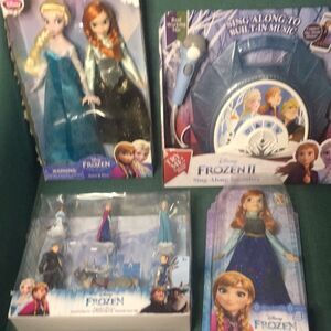 Disney frozen all sing along boom box, Disney frozen figurine playset, Anna & Elsa Doll set, and Disney frozen Anna doll.