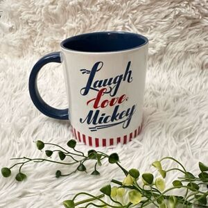 Text: The reverse side of the mug lists "Laugh. Love. Mickey.".