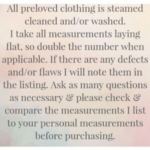 *All measurements are taken with a tape measure & are an approximation. Please take personal measurements before purchasing. Measurements are flat lay, so double when applicable Ex: pit to pit, waist, hip, thigh, leg opening.