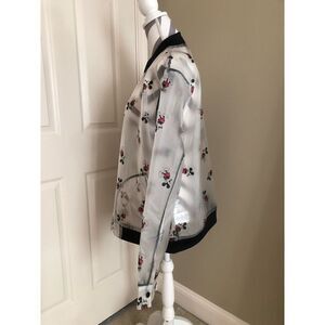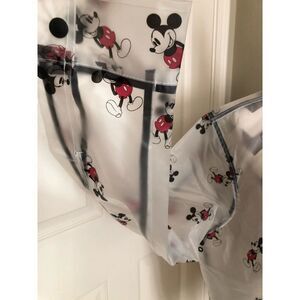 Like new. Worn once. Transparent frosted unisex Mickey Mouse bomber style rain jacket. Black ribbed collar and hem. Metal snap closure in front, pockets and cuffs. All over Mickey Mouse pattern. Air grommets under the arms to keep you comfortable. Created especially for Disney. Size XL.