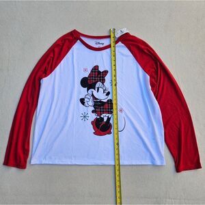 Red and white baseball-style long sleeve shirt with Minnie Mouse on the front