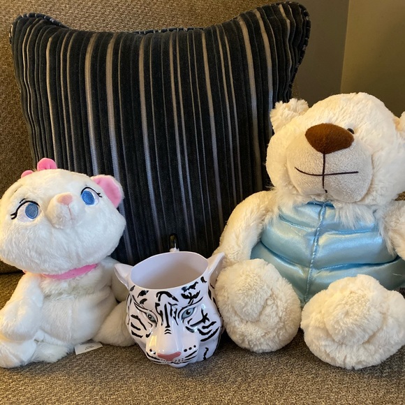 Disney/Children’s Grab Bag. Disney’s 10 inch Marie Plush-from the Aristocats. Adorable soft kitty with big blue eyes & pink ribbons. Tiger Cup measuring 4 inches high from the Greatest Show on Earth. And lastly, a soft 14 inch Bear with a baby blue vest already for winter & a snuggle.