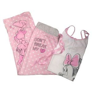 White tank, with adjustable pink spaghetti straps & Minnie Mouse prints. Pink with white polka dots, grey waistband & Minnie Mouse prints, pants. Pants are a pull on style, cropped, with a pink ribbon drawstring. They also say "Don't go breaking my {heart}".