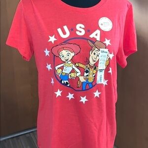 Brand new with tags! This short sleeved, crewneck red t-shirt reads, “USA,” and features jessy and woody from the Disney/Pixar toy story films! Super soft cotton and polyester blend. Size medium.