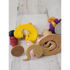 Product not all same brand, Rapunzel in middle missing, broken off arm, all Rapunzels have at least some paint scuffing, some scratches and marks on all, but otherwise in good condition, set of 5