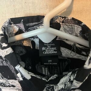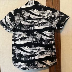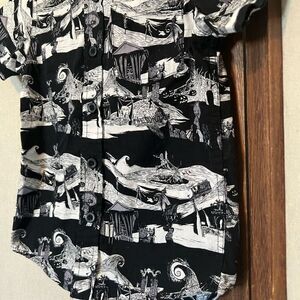 All over print retro Disney button down, featuring scenes from Tim Burton’s Nightmare Before Christmas.