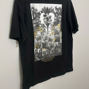 Crafted from soft, breathable 100% cotton, this shirt offers a comfortable, regular fit perfect for everyday wear or showcasing fandom pride. At the center of the black fabric stands the official 20th Anniversary illustration, a beautifully detailed design featuring iconic characters from the series—Sora, Riku, Kairi, and Mickey—surrounded by intricate patterns and the signature Kingdom Hearts heart emblem.