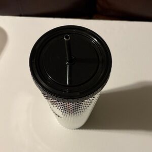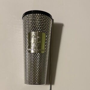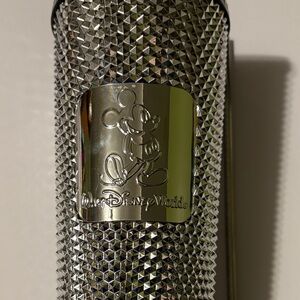 Stylish silver studded tumbler featuring a sleek design. Comes with a matching straw. This full size cup is collaboration between Disney and Starbucks on the front of the cup is Mickey Mouse and the back is a Starbucks symbol.