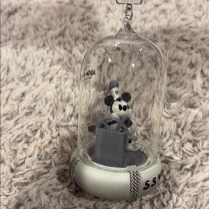 Classic Mickey Mouse in a glass dome. Features a vintage steamboat theme.