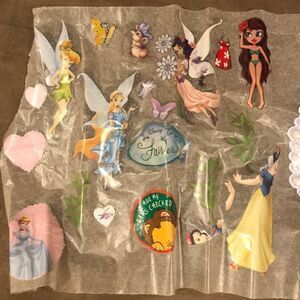 Includes Disney princesses, Tinker Bell characters, and others. Most decals are in great condition but some of them have ripped, as pictured, but they are still able to be peeled off and placed together so they won’t look ripped. They all peel off easily