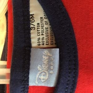 Onesie is red with blue collar, wrist bands and trim on the crotch