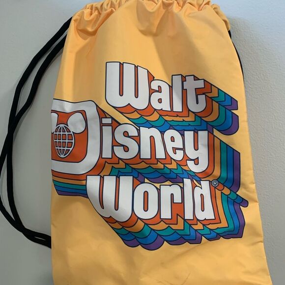 Bright yellow Disney backpack. Features colorful retro design. Drawstring closure. Perfect for Disney fans.