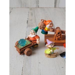 Product not all same brand, mild scratches and marks on all, small paint scuffing on snow white and small dwarf, set of 5, mine cart dwarf gem move and pair move up and down
