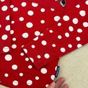 Adorable Disneyland long sleeve spirit jersey with red and white polka dots. Features a cute Minnie Mouse on front and name and bow on back.