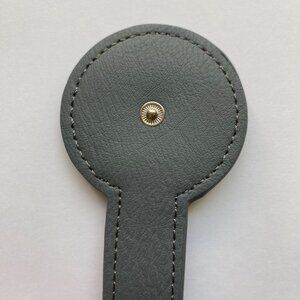 Colors/Print: gray, black, turquoise, white, purple; Haunted Mansion wallpaper print; Madame Leota on snap closure
