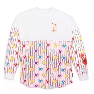Make a sweet addition to your style with this bold spirit jersey! Featuring puff print lettering and a popcorn box-inspired print the chic design is finished with colourful Mickey icons.