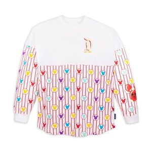 - Long sleeves with ribbed cuffs, ribbed crew neck, puffy popcorn Disneyland logo on back, puff Disney D on chest, striped Mickey Mouse balloon print, dropped shoulders, curved hem, red Mickey Mouse balloon on left sleeve, unlined
