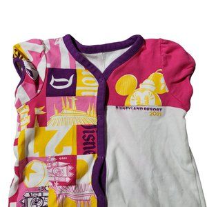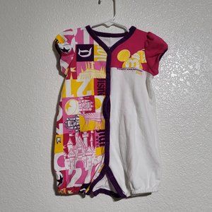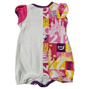 This cute Disney Small World Themed Baby Onesie - Featuring Disneyland Resort 2021 Onesie Rompe; graphic print of Disneyworld, and castle. Snap button all the way and short sleeves. 100% Cotton. Color: white, yellow, pink, and purple. In great pre-owned condition / normal wear / no flaws.