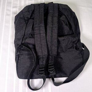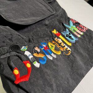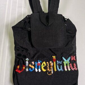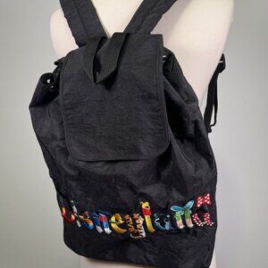 Authentic Disneyland Resort backpack in black nylon with colorful embroidered “Disneyland” logo, where each letter is styled after a beloved Disney character (Mickey, Pooh, Tigger, Minnie, and more).