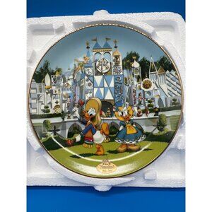 A meticulously crafted commemorative porcelain plate capturing the essence of Disneyland's iconic attraction, featuring Donald and Daisy Duck amid the stylized "It's A Small World" ride architecture.