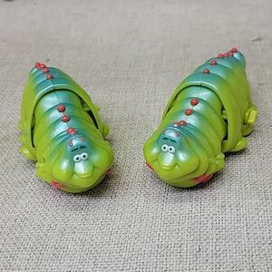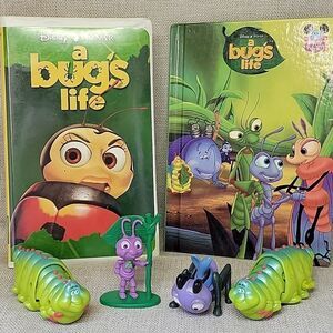 A cute bunch of figures from A Bugs Life. There are 4 figures and a hardcover book and a VHS movie.The figures... 2 Bugs Life Mc Donalds Happy Meal Toy Heimlich Caterpillar, Dot, and Cri-Kee.