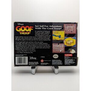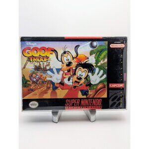 Join Goofy and Max on their adventure to find Keelhaul Pete in this 1993 original authentic Super Nintendo game, Disney's Goof Troop. Rated E for everyone, this game is sure to provide hours of fun as you navigate through five different stages, using barrels, bushes, and blocks to fend off pirates and solve tricky puzzles.