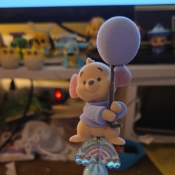 Adorable roo figurine holding a balloon over a rainbow pen