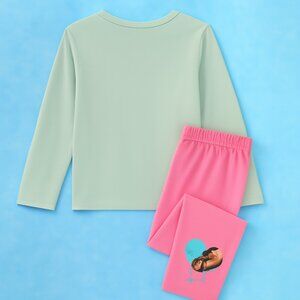 Let your child drift into dreamland with this cozy two-piece pajama set inspired by the beloved movie Spirit Untamed. The sage green top features a heartwarming scene of Lucky and Spirit sharing a quiet moment in the wild, surrounded by scenic skies and golden ground. The bright pink pants add a playful pop of color and include a matching graphic near the ankle—perfect for fans who carry the spirit of friendship and freedom wherever they go.
