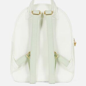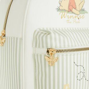 Keep it cute and classic with this Winnie the Pooh backpack packed with thoughtful details. Made from stylish white faux leather, it’s detailed with soft stripes and a sweet print of Pooh and Piglet among playful florals. The golden tone hardware adds a hint of shine, while the front zip pocket keeps essentials close. The main compartment has a secure zip-top closure, and the adjustable straps and top handle offer versatile carrying. Just the right size for school, travel or everyday adventures!