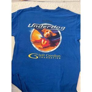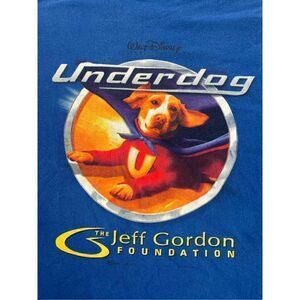 A good Disney fan tshirt from Disneys 2007 Underdog movie. On front across chest has the underdog logo and a big U in top left “Jeff Gordon Foundation” written. On back is Underdog flying.
