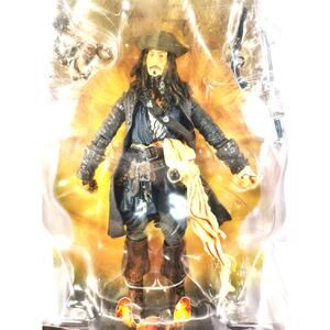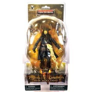 The product is a new Disney action figure of Captain Jack Sparrow from the Pirates of the Caribbean Dead Man's Chest movie. This 6-inch figure is made of ABS plastic and features the beloved character in colorful detail, perfect for fans of the Disney Pirates of the Caribbean franchise. With its pirate theme and age level of 5 years and up, this Captain Jack Sparrow figure is sure to be a hit with collectors and kids alike.