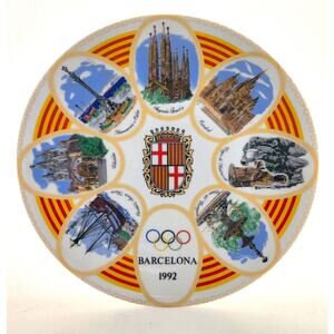 Nice display plate commemorating the 1992 Summer Olympics that took place in Barcelona, Spain. This is a brightly colored plate depicting 7 historical and well known places in Spain. This is a great plate for any collector or Olympic enthusiast. It is 9.5" in diameter and unmarked on the back.