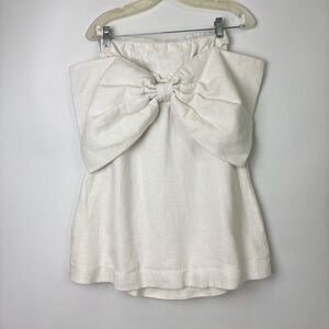 Stunning sleeveless linen mini dress with large bow accent on back and side pockets. Size 6. About 14 inches from pit to pit laying flat. Some stretch to bust. About 26 inches long. Excellent condition with no defects.
