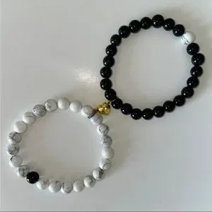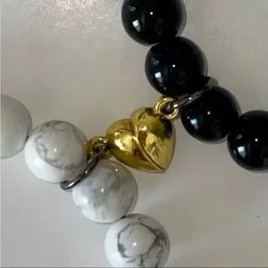 Handmade with 8mm white glass howlite, black beads & a magnetic gold heart clasp.