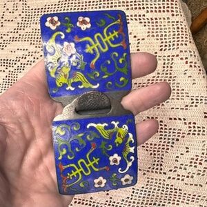 Unusual handmade enameled metal belt buckle that was acquired in China in the 1940s by one of my traveling relatives. It is likely from the 1920s or earlier. The metal is heavy weight & the buckle is very sturdy. It has wonderful weight & appears to have been a man's belt buckle that was once worn regularly.