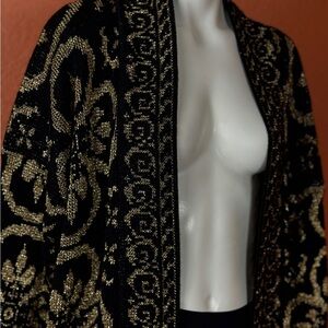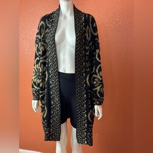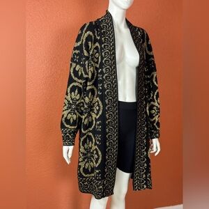 This elegant women's sweater features a striking black and gold floral pattern, perfect for adding a touch of sophistication to your wardrobe. Ideal for both casual and formal occasions cardigan in good condition.