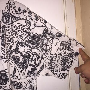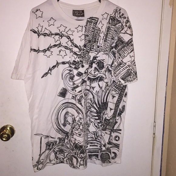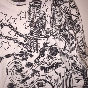 Distortion Custom Rags Graphic Tee in a size Large. It is mostly white with black graphics vocal point being a skull with a plain white back.