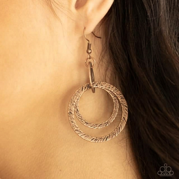 Etched and embossed in shimmery textures, a trio of antiqued copper hoops interlock into a dizzying lure.