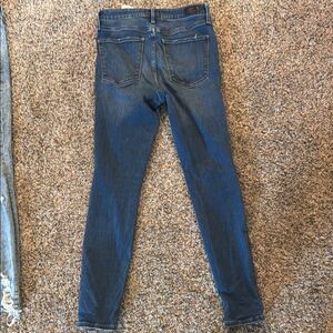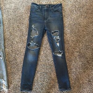 Stylish distressed blue jeans perfect for a casual look. Comfortable fit with a trendy design. 27 inch inseam