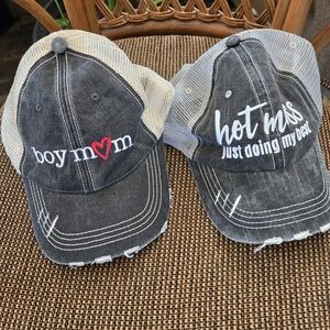 Set of two distressed trucker hats. Features 'boy mom' and 'hot mess' embroidery. Stylish and casual.