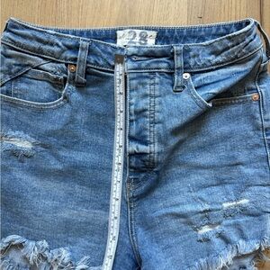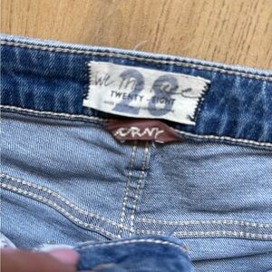 Stylish distressed CRVY line blue denim shorts perfect for casual outings. Features a trendy frayed hem for a chic look.